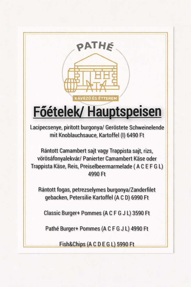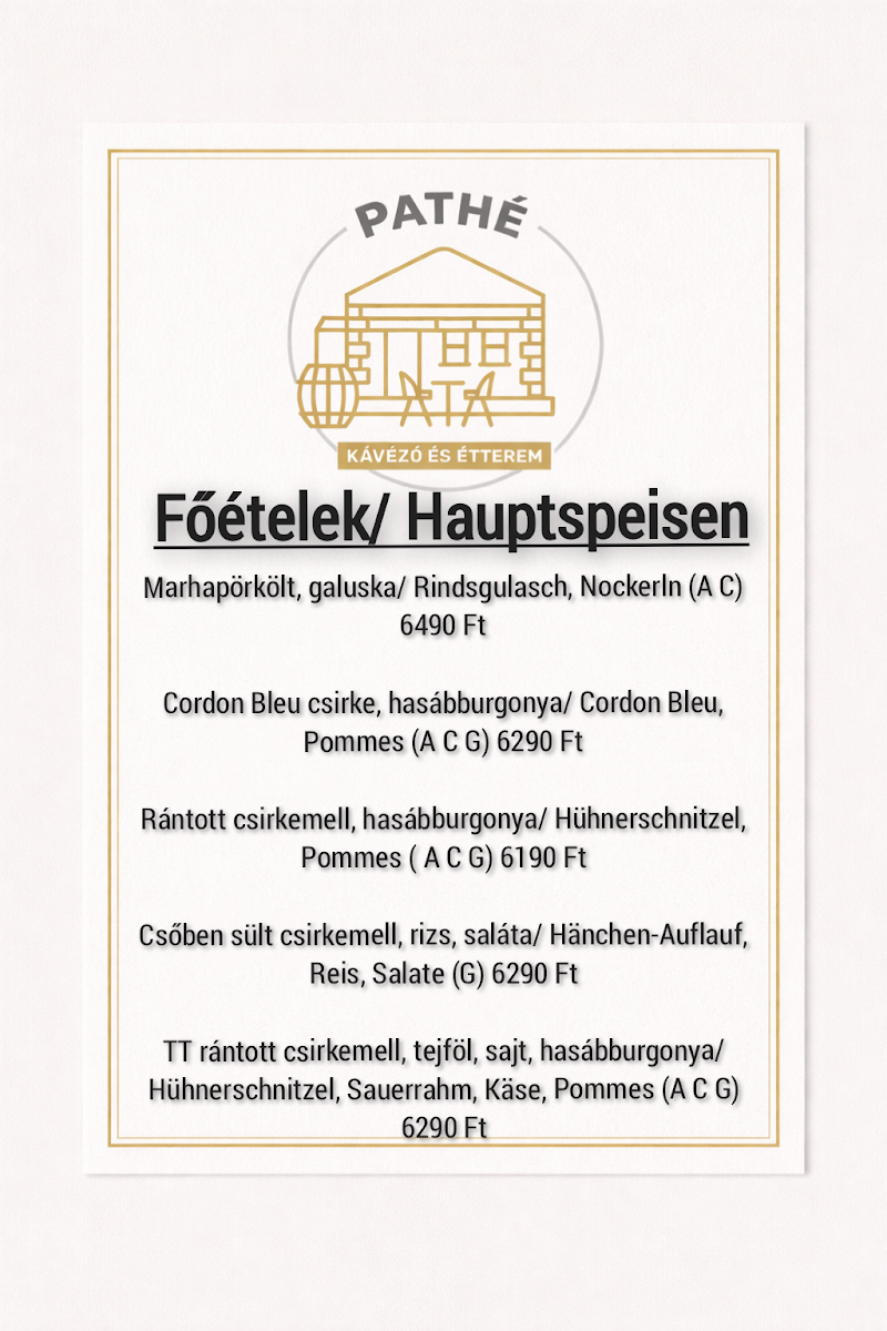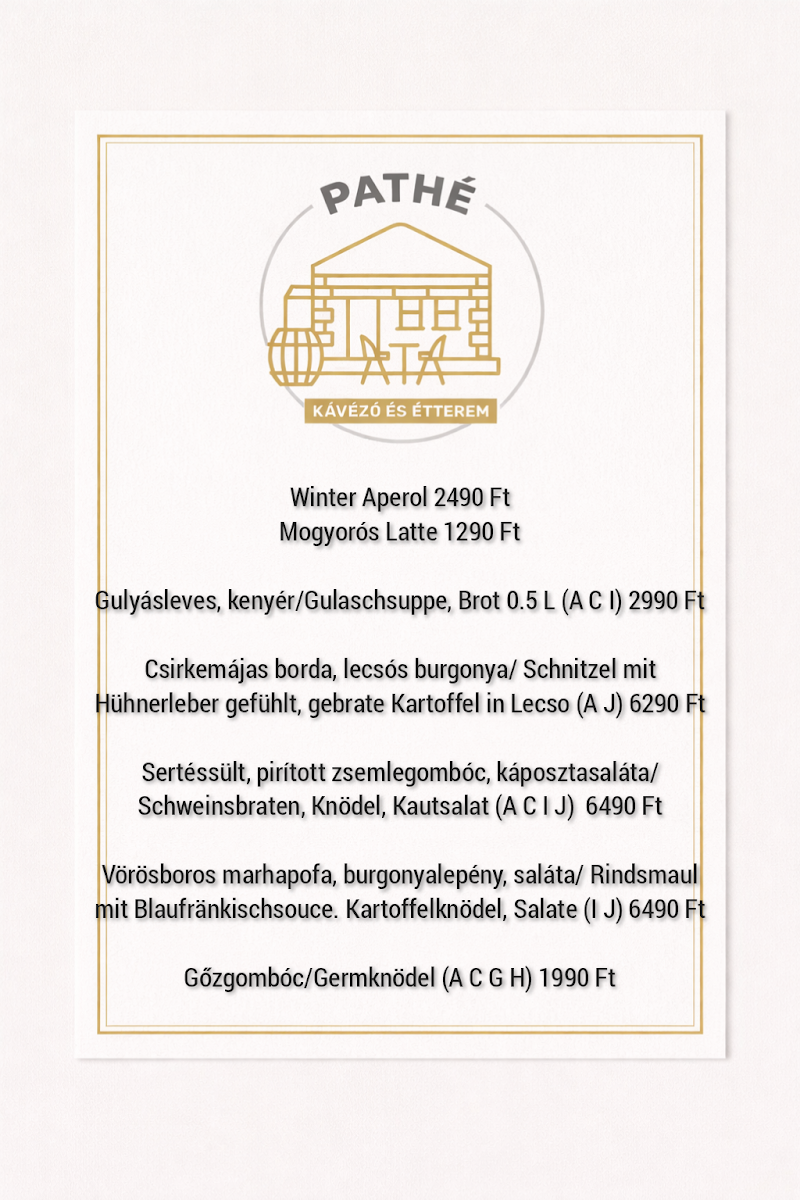 At Pathé Kávézó És Étterem in Fertőrákos, the menu feels thoughtfully balanced between comforting Hungarian classics, café-style favorites, and easygoing drinks-making it a convenient stop whether you’re after a full meal or just something sweet with a warm cup in hand. For hearty, familiar mains, Cordon Bleu delivers that satisfying, crowd-pleasing choice, while Marhapörkölt Galuskával offers a more traditional Hungarian direction with a rich, filling character paired with galuska. If you prefer something more casual and shareable, Pathé Pizza stands out as a straightforward option that fits the relaxed, café-restaurant vibe. On the lighter side, Camembert adds a simple yet appealing bite, and Rántotta keeps things classic for anyone wanting a quick, no-fuss plate. Dessert is where the menu really rounds out the experience: Császármorzsa brings a homestyle sweetness that feels local and comforting, while Csokiszuflé leans into an indulgent, chocolate-forward finish. To drink, the selection moves smoothly from refreshment to warmth-Aperol Spritz is the obvious pick for a bright, social sip, and Gyümölcstea works perfectly as a cozy, fruity alternative when you want something non-alcoholic. Overall, these highlights show a menu built to satisfy different moods-savory, sweet, light, and hearty-without losing its distinctly Hungarian touch.